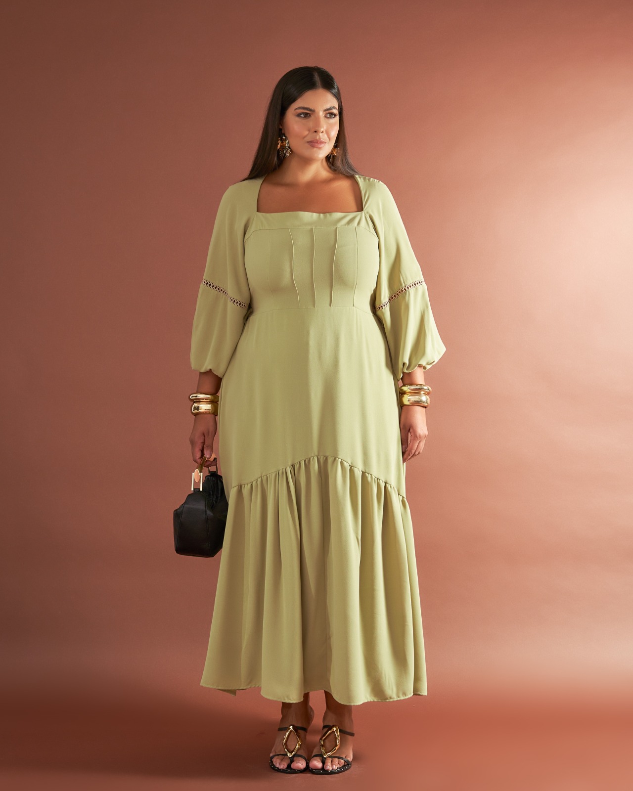 vestido midi com decote quadrado verde 44